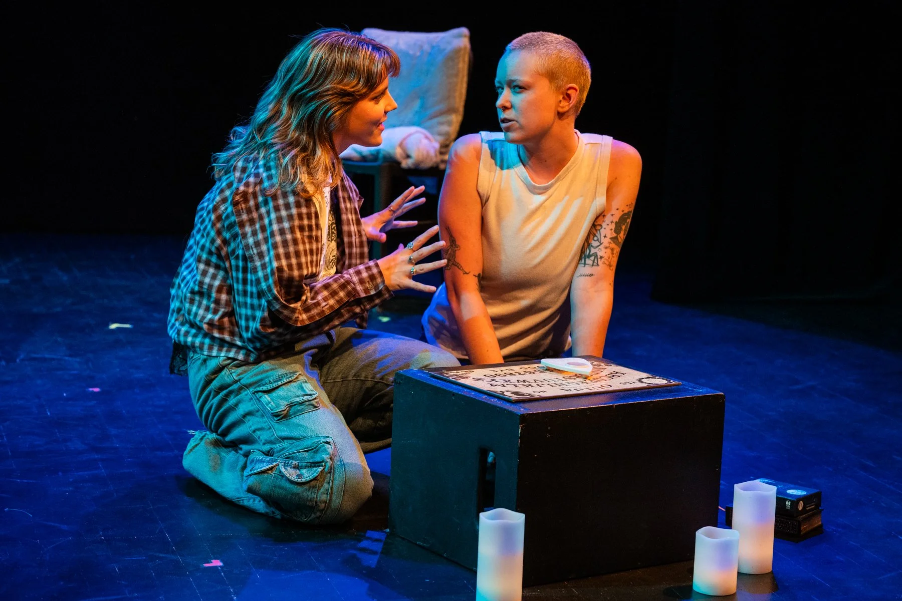 Long-term partners who are searching for a way to spice up their sex life discover a spooky surprise. GHOST PLAY navigates exploration, tension, and non-monogamy through communication, two lesbians realize their apartment is haunted - and gain a ghostly friend amongst their sapphic shenanigans.